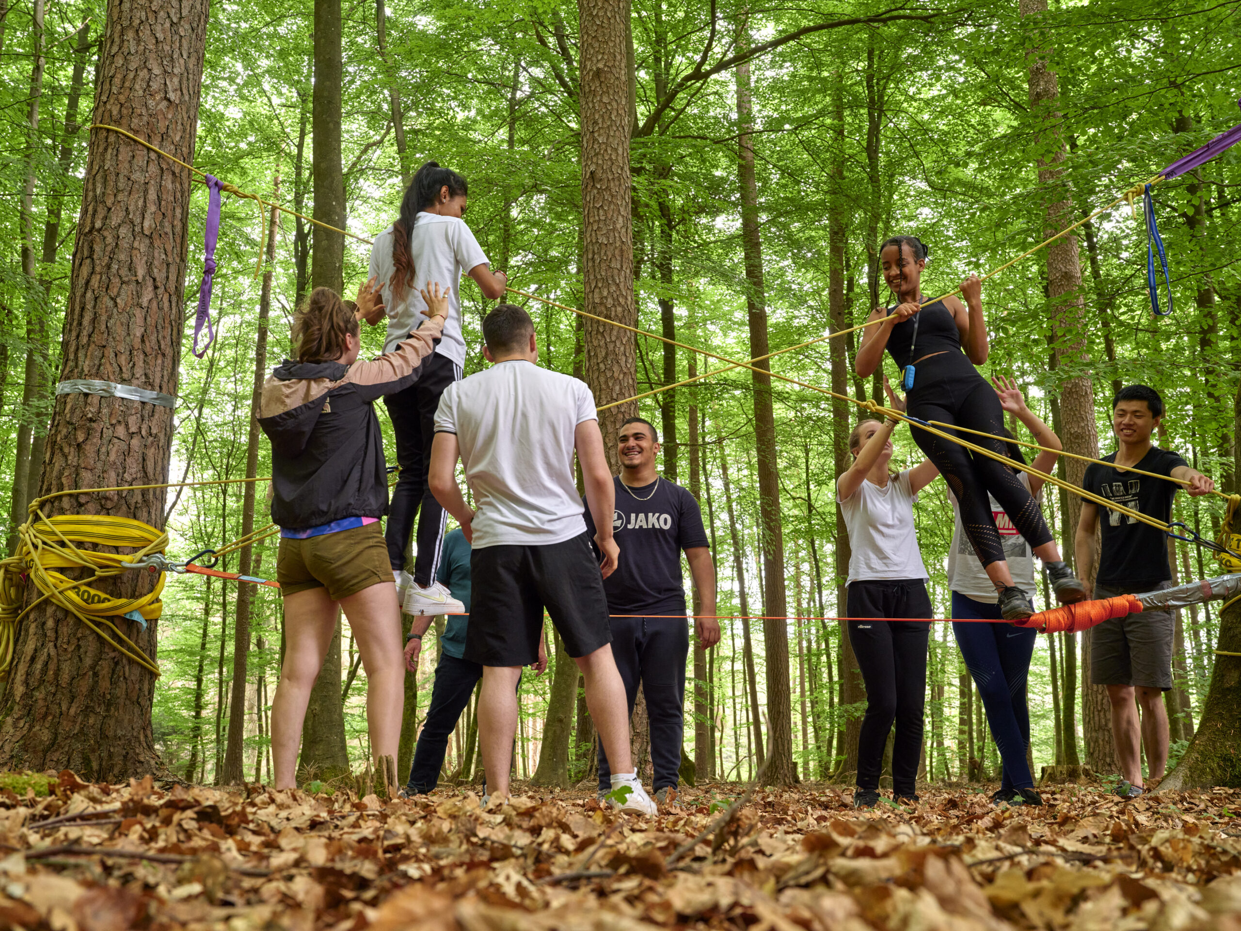 Spannende Naturerlebnisse in der Region Müllerthal – Kleine Luxemburger Schweiz: intuitives Bogenschiessen, Erlebnisrucksack, mobiler Niedrigseilparcours, Geocaching und Kooperationsaufgaben.