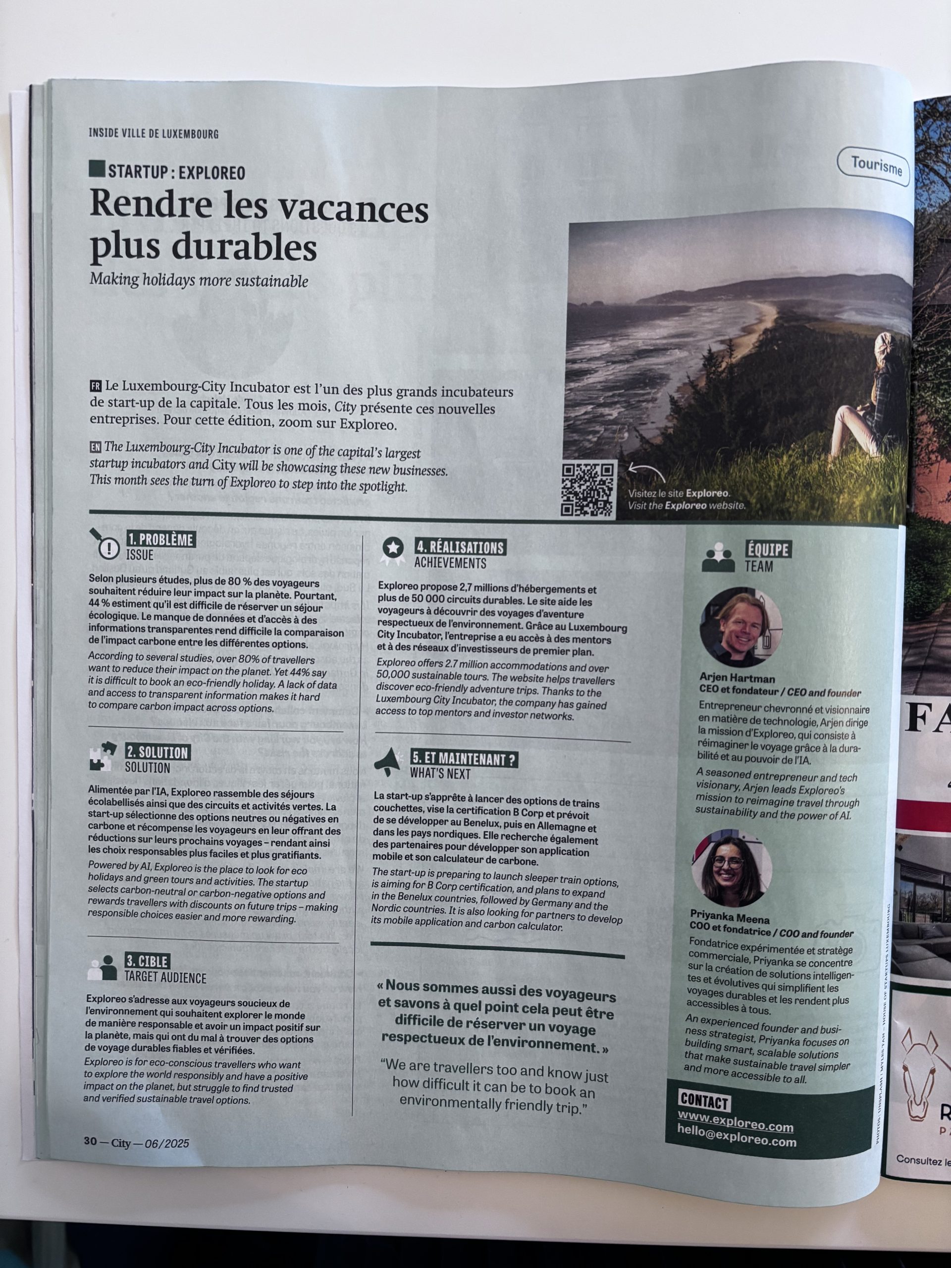 • Environnemental : à ce jour, Exploreo a planté 370 arbres et évité 5 tCO₂e grâce à des projets de compensation vérifiés.