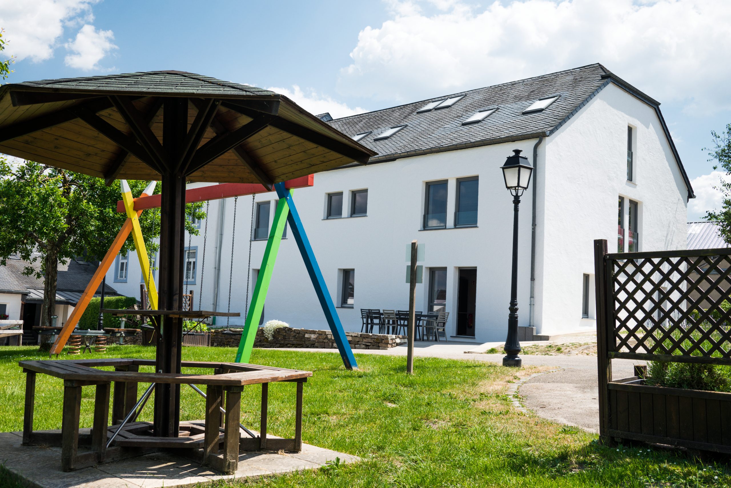 L’année de la chute du mur de Berlin chez nos voisins allemands, l’association « Syndicat d’intérêts Binsfeld-Holler-Breidfeld » a acquis le terrain avec la maison « Bei Glesener », vieille de presque 200 ans. Les six années qui ont suivi ont été mises à profit par des bénévoles, pour la plupart très motivés, pour effectuer des travaux de rénovation et de transformation de grande envergure. Le résultat final était visible : une extension du musée rural « A Schiewesch » déjà existant, 2 petits appartements de vacances et un grand gîte d’étape pouvant accueillir des groupes jusqu’à 28 personnes maximum. Le gros carnet de réservations s’est rempli avec une grande affluence de groupes de jeunes, confirmant ainsi que c’était la bonne décision de s’engager dans cette voie.
